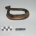 Description : Outil composé d'un manche de bois affectant la forme d'un croissant aux cornes peu marquées, dans lequel est inséré une tige de fer plat recourbée en une boucle fermée. La partie supérieure de cette tige se prolonge en une lame dont la section est semi-elliptique, tranchant orienté vers le bas.