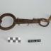 Description : Ustensile en forme de pince composé de deux fers ronds, chacun affectant la forme d'une demi-ellipse, les deux fers étant symétriques en vis-à-vis. Ils sont prolongés par deux pièces de fer de section rectangulaire articulés l'un sur l'autre, et présentant à leur extrémité un orifice circulaire dans lequel passe un anneau rond. Une lamelel formant ressort est rivetée sur la tranche de cette partie de section rectangulaire et un petit rectangle de fer qui y est perpendiculairement enfilée permet de régler la force du serrage.