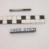 Description : Tige d'acier comprenant quatre parties : - une extrémité pointue ; - puis, dans le sens de la longueur, trois rangée de stries horizontales, chacune étant séparée de l'autre par un évidement ; - ensuite, toujours dans le sens de la longueur, un tronçon où le métal est lisse (section circulaire) ; - enfin, l'autre extrémité (sup), de section carrée, l'embase étant percée.