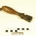 Description : Manche en bois profilé pour s'adapter à la main avec une virole en laiton. Fer à déformer « uni » à soie noyé : trapèze au sommet arrondi encadré de deux enchacrures (Lg 0,4 cm) . Un morceau de cuir perforé cloué à l'extrémité du manche permet de suspendre l'outil.