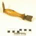 Description : Manche en bois profilé pour s'adapter à la main avec une virole en laiton. Fer à déformer « uni » à soie noyé : trapèze au sommet arrondi avec une enchacrure centrale rectangulaire (Lg 1,8 cm). Un morceau de cuir perforé cloué à l'extrémité du manche permet de suspendre l'outil.
