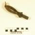 Description : Panne rectangulaire avec un tranchant bombé. (Larg : 1,5 cm) montée à soie noyé et virole sur un manche en bois profilé. Unel anguette de cuir en partie incisée clouée ultérieurement permet de suspendre l'outil.