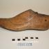 Description : Forme de pied taille 36 composée de deux pièces de bois. La forme est perforée dans l'axe de la jambe par un trou armé d'un cylindrique métallique (D: 1 cm). La forme est renforcée par une semelle métallique époussant la plante du pied. La semelle est vissée en 7 points. Une perforation latérale au niveau du talon laisse supposer que l'on pouvait passer un lacet pour suspendre la forme.