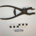 Description : Pince avec articulation en "X" Les branches arquées sont croisées et rivées. La pince est possède un ressort d'écartement. Les mâchoires sont arqués et se termine par des mors droits.. Au niveau supérieur de l'articulation se trouve une petite pince à bec. Une lamelle métallique et une patte en "L" maintiennent le bouton en place. Deux encoches sur le mors inférieur permettent de replier plus facilement les deux tiges du bouton.