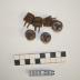 Description : lot de talonnettes composées de 5 épaisseur de cuir (D mini : 1,5 cm D max : 2 cm)) perforé triangulairement par 3 semences depassant de l'extrémité supérieure pour se planter au niveau du talon.