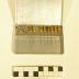 Description : Boîte sur plan rectangulaire à fond plat aux angles arrondis et bords bas droits avec couvercle à charnière. La boîte est compartimentée pour contenir 12 aiguilles à embout laiton et pointe acier perforé se prolongeant par un fil d'acier. La bôite contient 8 aiguilles et 2 embouts en acier de seringue.
