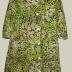 Description : Blouse en coton imprimé col "pelle à tarte" avec des motifs de fleurs aux tonalités vertes et jaunes femée frontalement par 6 boutons en plastique blanc. Deux poches latérales. Dans l'une se trouve la ceinture de la blouse.