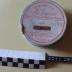 Description : Emballage pharmaceutique sur plan circulaire à bords droits (H : 2 cm) pour la partie inférieure et et 1 cm pour la partie supérieure qui s'emboîte sur la partie inférieure. La boîte contient de la poudre.