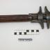 Description : Outil composé d'un manche en bois cylindrique, cannelé dans le sens de la longueur, dont l'extrémité supérieure est dotée d'une bague, puis d'une tige filetée (D : 1,8 cm, L : 9,4 cm) dans le prolongement. Vissées perpendiculairement à cette tige, deux pièces symétriques (affectant, vues de profil la forme d'un chapeau de gendarme), qui présentent leur plus grande face en vis-à-vis. La pièce sup. comporte, sur sa grande face inférieure, deux minces tiges métalliques fixées, perpendiculairement à cette face, de part et d'autres de la grosse tige filetée (et parallèlement à cette dernière). La pièce inférieure présente, elle, la traversant de part en part, deux orifices circulaires, où coulissent les deux tiges sus-citées (afin de guider, en conservant leurs faces bien parallèles, les deux masses métalliques.)