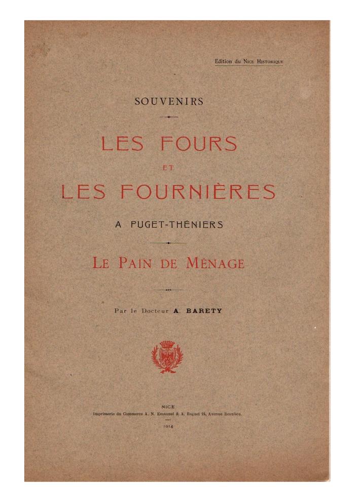 Description : Barety A. - souvenirs - Les fours et les fournières à Puget-Théniers - le pain de ménage, édition du Nice Historique, 1914, Nice, 7 p.