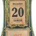 Description : Calendrier cartonné mural en forme de cartouche avec œillet de fixation. Il est décoré par deux colonnes végétalisées, surmontées d'un chapiteau au profil de rapace, soutenant un cartouche de feuillage dominé par une tête de femme. Les couleurs dominantes sont le vert et le bleu, réhaussé d'or