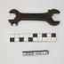 Description : Tige droite de fer plat, dotée, à chacune de ses extrémités, d'une excroissance de forme elliptique, dans la partie extérieure de laquelle est pratiqué un orifice rectangulaire. Chacune des excroissances plates présente latéralement une petite clé supplémentaire orientée à 90° de la clé principale, sous la forme de deux petites saillies triangulaires, symétriques l'une à côté de l'autre. Le manche présente une partie centrale moins épaisse en ellipse allongée. Lg orifice A : 2,1 cm Lg orifice B : 2,5 cm