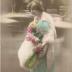 Description : Carte postale représentant une jeune femme retenu d'une robe de soirée et d'une fourrure blanche tenant à la main un bouquet. En arrière plan un lac et un parc peint sur une toile.