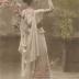 Description : Carte postale représentant une jeune femme en tenue à l'antique tenant une branche de cerisier. A ses pieds, se trouvent quatre colombes.