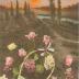 Description : Carte postale représentant un panier contenant des fleurs et décoré de ruban bleu-blanc-rouge. Au second plan se trouve trois maisons sur une butte ou poussent des cyprès et ou coule non loin une rivière au soleil couchant.