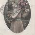 Description : carte postale représentant dans une mandorle une jeune fille regardant un bouquet.
