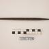 Description : Barre de métal ayant une section carrée. La section maxi est ici de 0,6 cm. Cette section maxi est considérée comme la "base" de l'outil, de laquelle part, d'un côté, une pyramide très allongée, tronquée (section à l'extrémité sup. 0,2 cm), comportant des stries sur chacune de ses faces. De l'autre côtés de la base, à 180° de la première pyramide tronquée part une autre pyramide ayant les mêmes caractéristiques, sauf qu'elle est plus fine et courte et lisse : il s'agit de la queue, que l'on peut introduire dans l'orifice d'un manche en bois. L partie striée : 15,8 cm
