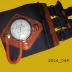 Description : Brassard en tissu fort bleu marine. Trois sangles reliées entre elles par des tiges en en matière plastique permettent de régler le diamètre du brassard. Un tensiomètre est fixé sur le brassard par l'intermédiaire d'un carré en cuir. Une tubulure est prévue pour y relier la poire gonflante (absente)
