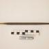 Description : Barre de métal ayant une section triangulaire. La section maxi est de 0,8 cm. Cette section est considérée comme la "base" de l'outil, de laquelle part, d'un côté, un tétraèdre très allongé, tronqué (section à l'extrémité 0,4 cm), sur les trois faces duquel sont gravées des stries. De l'autre côté de la base, à 180° de ce tétraèdre, part une pyramide régulière à base hexagonale, très effilée : il s'agit de la queue, que l'on peut introduire dans l'orifice d'un manche en bois. L partie striée : 15,6 cm. La queue est recouverte, à la pointe, de peinture jaune, plus haut, de peinture rouge.