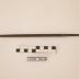 Description : Barre de métal de section circulaire. La section maxi est de 0,7 cm. Cette section maxi est considérée comme la "base" de l'outil, de laquelle part, d'un côté, un tronc de cône très allongé (section à l'extrémité sup. : D : 0,4 cm), présentant des stries fin, mais avec de nombreuses stries parallèles. De l'autre côté de la base, à 180°, part une pyramide tronquée, allongée, lisse : la queue, à introduire dans l'orifice d'un manche en bois; L partie striée : 18,8 cm.