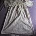 Description : Vêtement de nuit pour femme. Confection main et machine à coudre. Sans col . Encolure bordée de broderie plus importante sur le devant. Un empiècement arrière et avant. Ouvert sur le devant sur 42 cm. L'ouverture est doublée sur la droite d'une broderie au point d'épines. et or. 4 boutons de nacre et boutonnières permettent la fermeture.Les manches courtes (29 cm) sont froncées à la base et bordée d'une petite broderie. Des initiales brodées C O sur le devant au niveau de la poitrine.