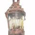 Verre sur plan circulaire à pied annulaire. Les bords sont droits, à pans sur 5 cm puis évasés. Le verre est serti au sommet et à la base par des anneaux métaliques plats et circulaires. Celui de la base (Lg : 2 cm) fait office de socle. Les deux anneaux sont reliés par une bande métallique perpendiculaire au plan du cercle. L'anneau supérieur est muni d'une charnière à gond afin de fiser le toit/couvercle sue le verre. Le toit est un cône tronqué se fermant par une patte à encoche qui se crante sur l'ergot de l'anneau supérieur. le toit est entaillé d'encoches en forme d'écaille. Au sommet est fixé 2 petites bandes métaliques recourbées aux deux extrémités. Une coupelle à quatre pans surbaissés est fixée sur un second fil de fer se terminant par un anneau afin de permettre la suspension de la lanterne. A l'intérieur se trouve un porte mèche sur plan circulaire. Un fût cylindrique permet de passer la mèche, une patte se terminant en volute permet de fixer le porte mèche sur le rebord.